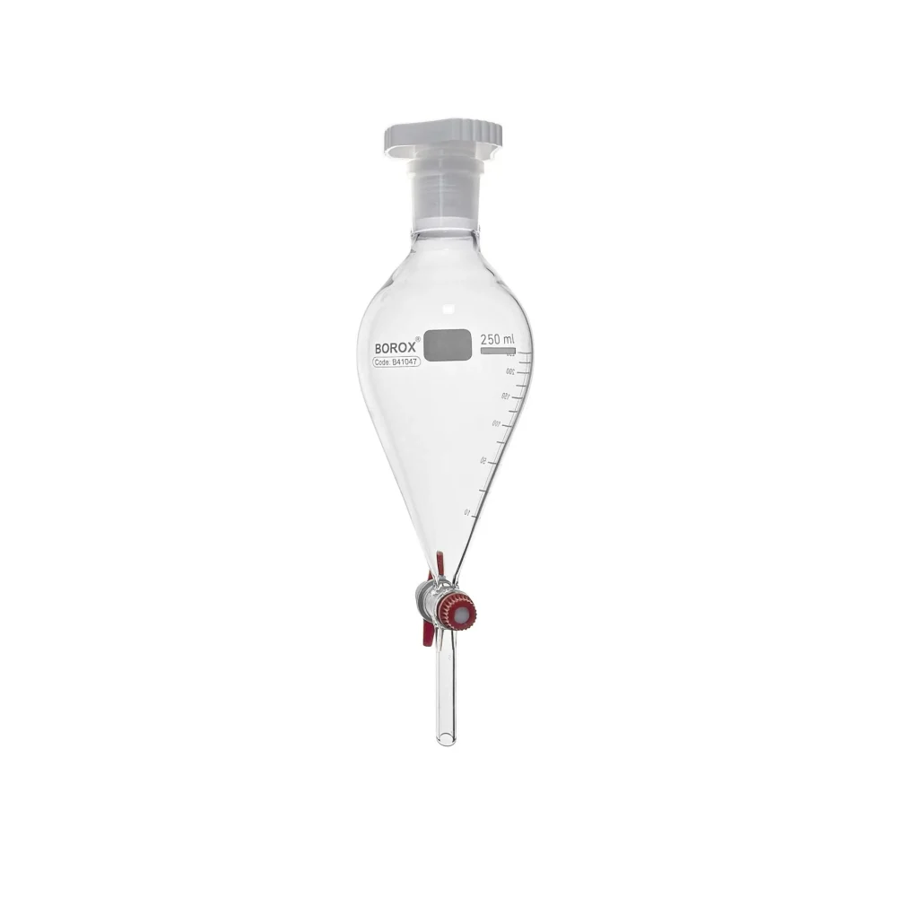 Ayırma Hunisi Armudi Cam Musluklu, yüksek dayanıklılığa sahip borosilikat camdan üretilmiştir. Konik armudi biçimi, sıvıların hassas şekilde ayrılması ve kontrollü boşaltma işlemlerinde kullanım kolaylığı sağlar. Sızdırmaz ve kendinden kaygan yüzeyli cam musluk, yağlama gerektirmeden güvenli akış kontrolü sunar. Polietilen veya cam kapak seçenekleriyle tamamlanmıştır. Kimya, biyoloji ve farmasötik laboratuvarlarında faz ayrımı, çözeltilerin hassas ayrıştırılması ve kontrollü sıvı boşaltma işlemlerinde kullanılır.